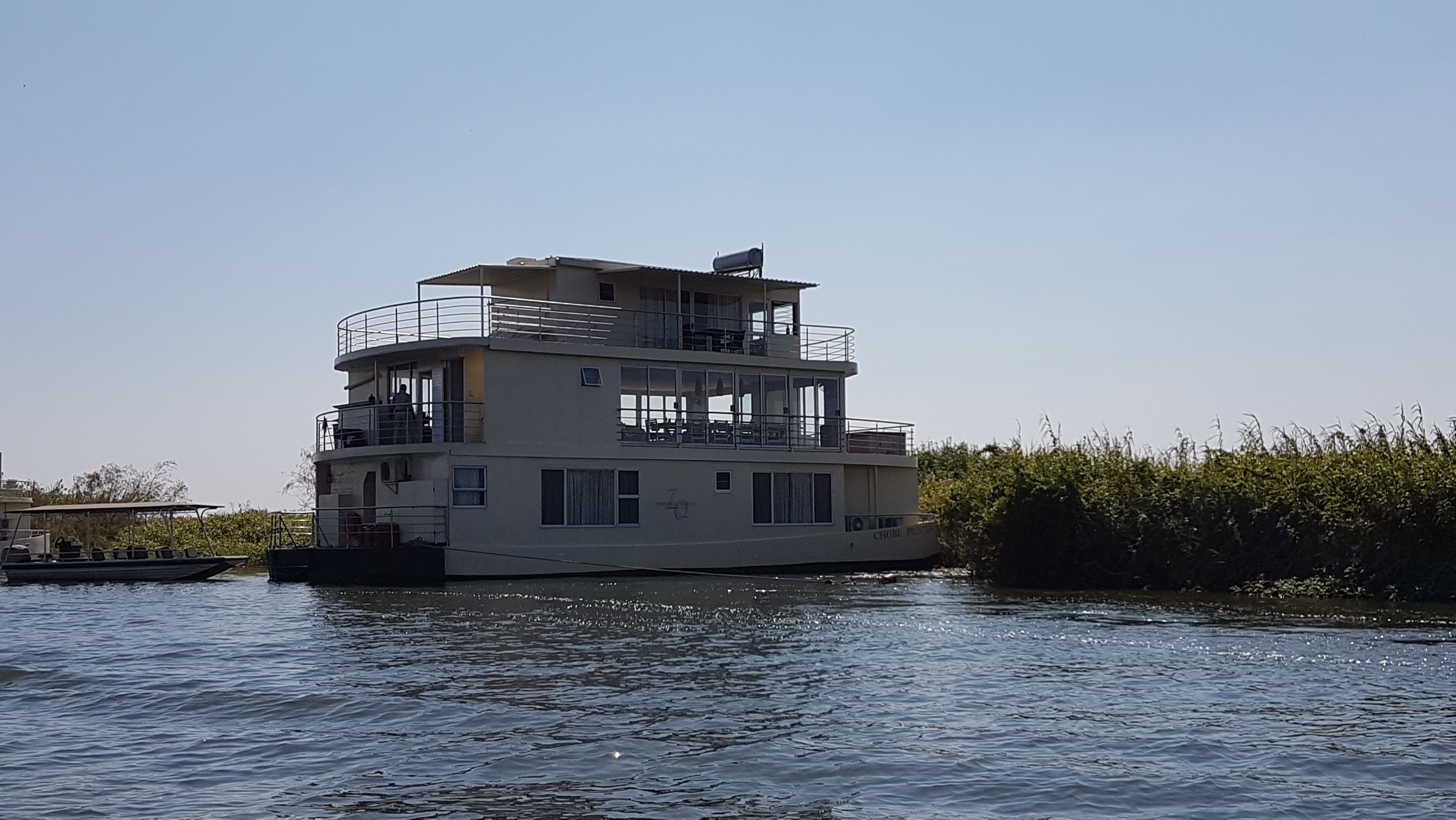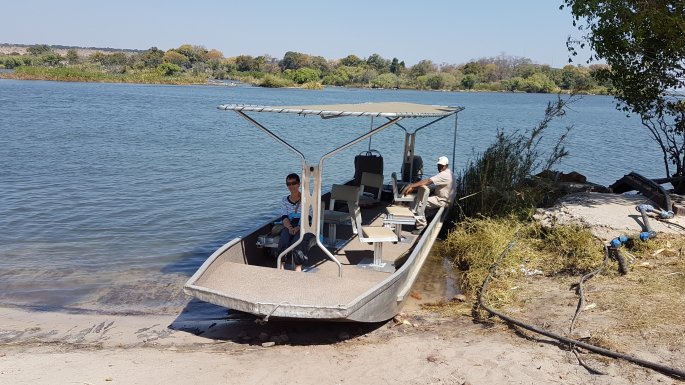 Départ de notre lodge, pour passage de frontière au Botswana, et quelque minutes après en Namibie. Le poste frontière de Namibie se trouve sur une île au milieu du fleuve Chobe qui est un affluent du Zambeze. Un bateau nous amène au poste frontière, où avant de nous donner notre visa on nous prend la température pour être certain que nous n’importons pas de maladie.