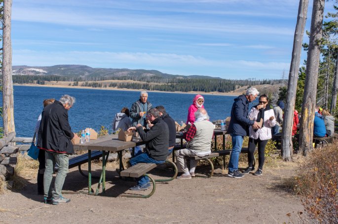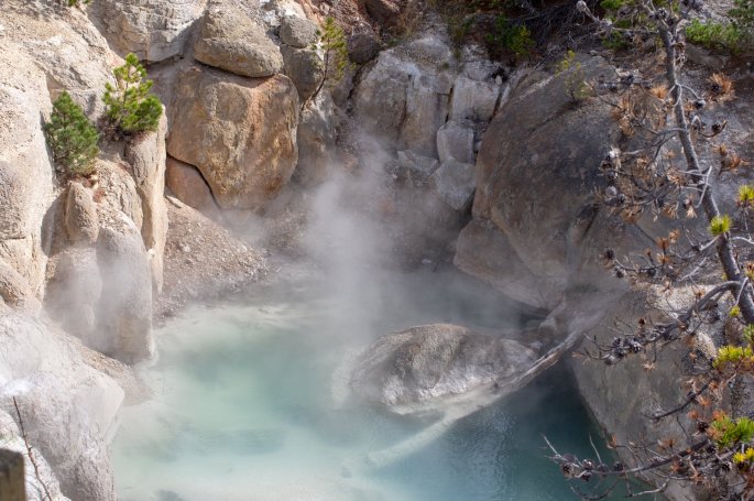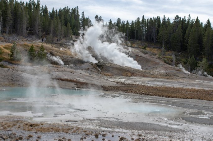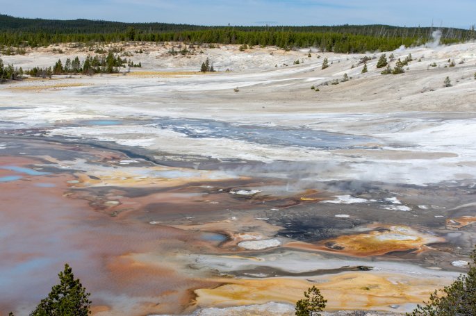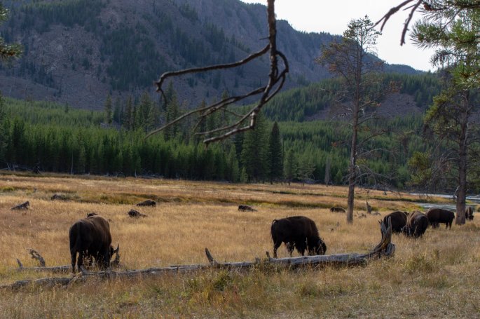 Fabuleuse journée où nous avons vu 2 ours (malheureusement trop loin pour la photo), des troupeaux de bisons, des canyons et cascades, et des paysages volcaniques avec fumeroles, bassin bouillonnant, (comme en Islande mais en plus grand). Nous n’avons pas vu de geyser (c’est aléatoire), mais on ne désespère pas d’en voir demain.