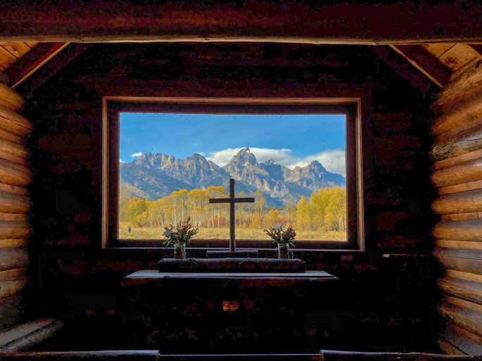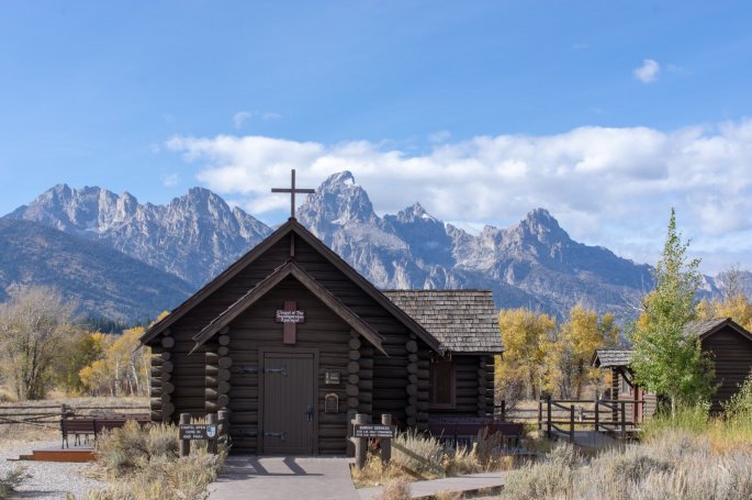 Une petite chapelle tout en bois qui donne sur le grand téton.