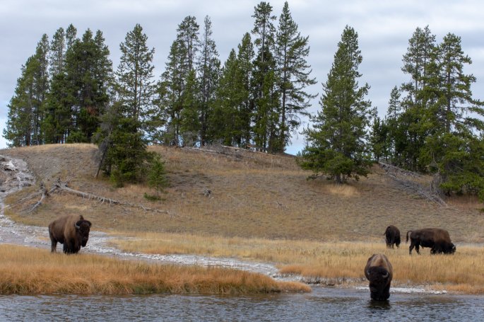 En cours de promenade rencontre impressionnante avec quelques bisons au bord d’une rivière.