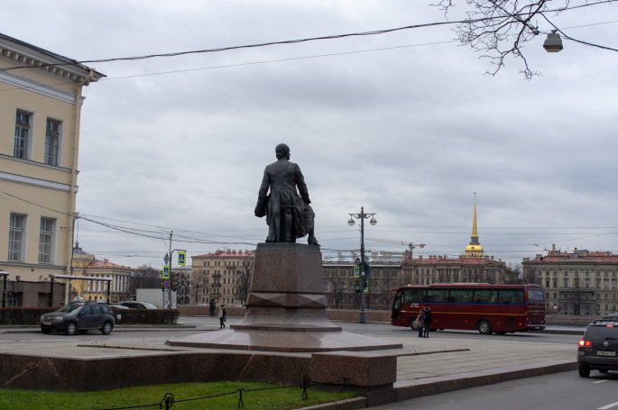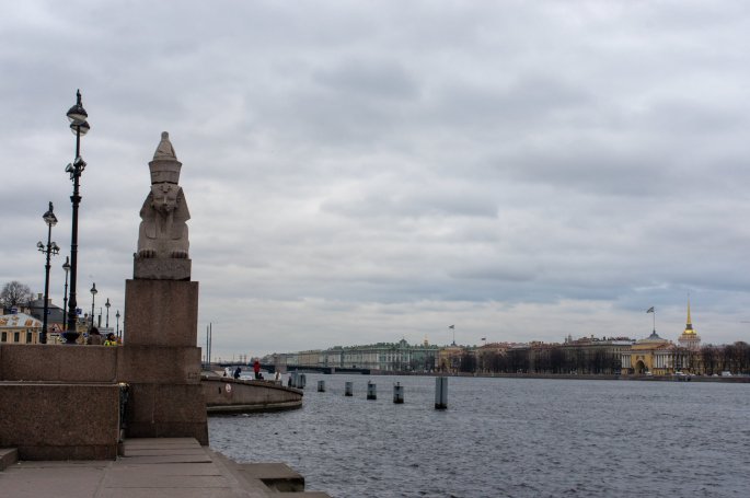 Le quai au sphynx (ce sphinx à étéacheté vers 1800 à l’Égypte). Au loin offre la forteresse Pierre et Paul dont on distingue les clochers dorés