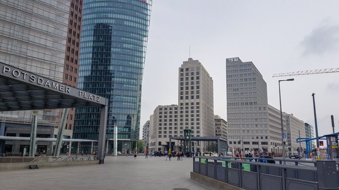 La postdamer platz, siège de la première gare à Berlin pendant la période prussienne, détruite ( comme l’ensemble de Berlin) pendant la seconde guerre mondiale n’a pas été reconstruite après la guerre. Située du côté Est, cette place faisait partie intégrante du no man’s land entre les 2 parties de Berlin.