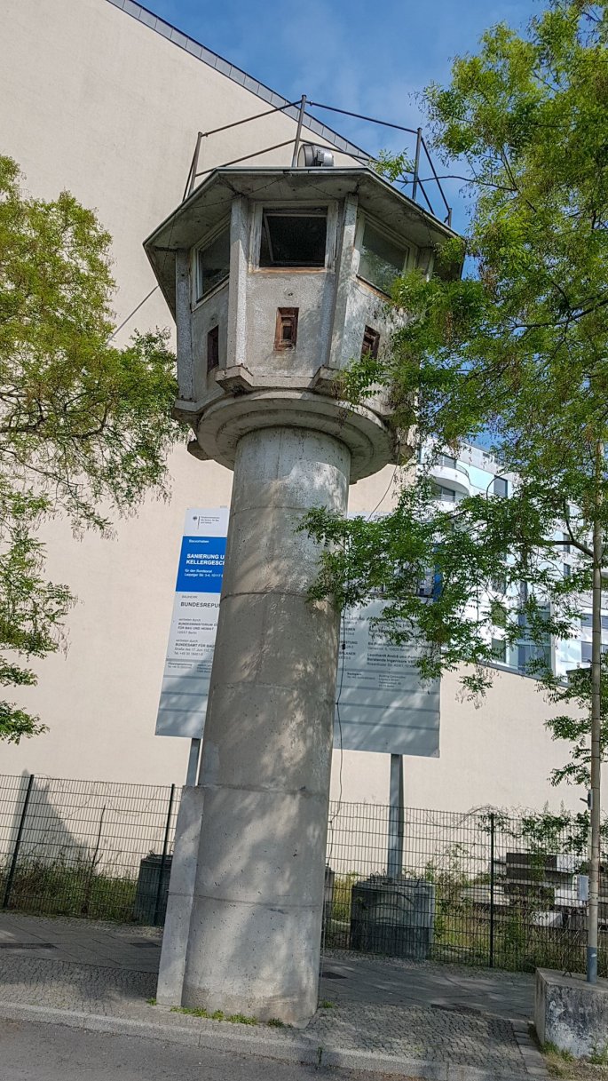 Il reste sur la place un ancien mirador de surveillance du mur.