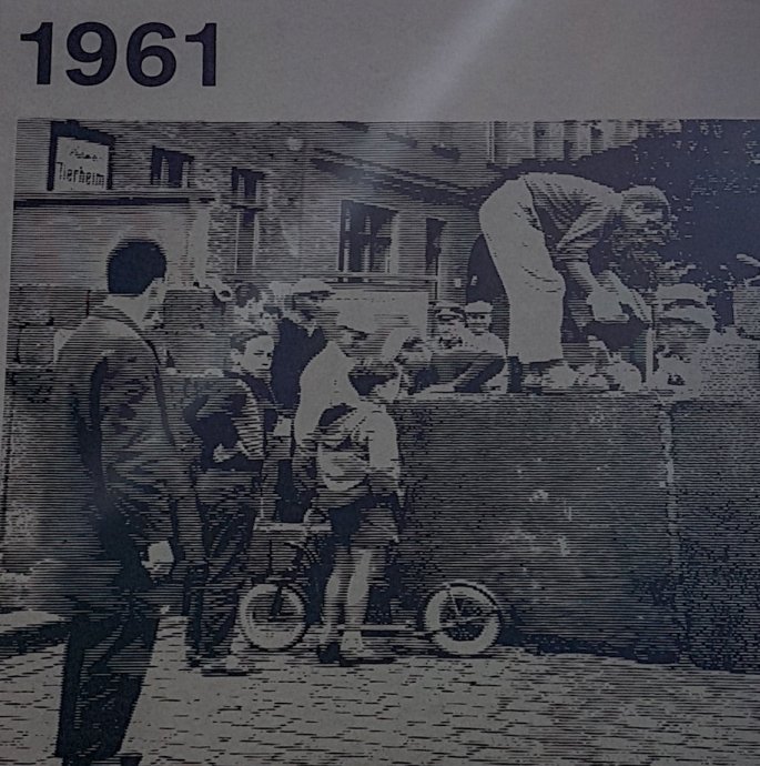 Sur les immeubles actuels, on peut voir des reproductions grand format de photos sur la construction du mur, et de tentatives de fuites.