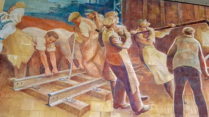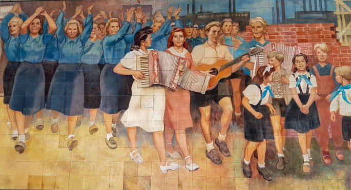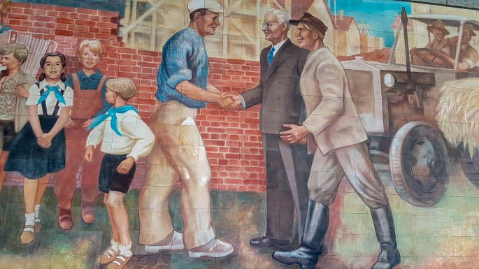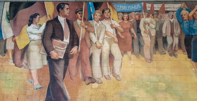 C’est l’ex ministère de l’aviation, transformé en gouvernement de la RDA, où sur une face du bâtiment les bas reliefs nazis ont été remplacés par une grande fresque à la gloire du régime socialiste et de ses bienfaits.