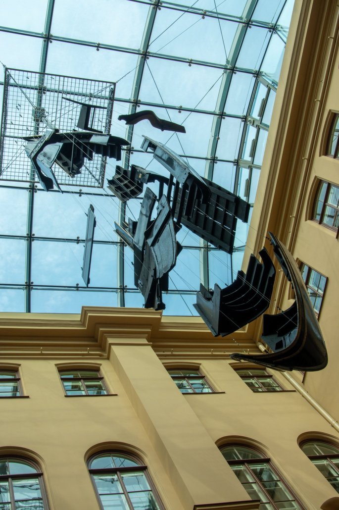 La cour intérieure de la maison de la bourse avec une sculpture représentant une chaloupe totalement démêmbrée.