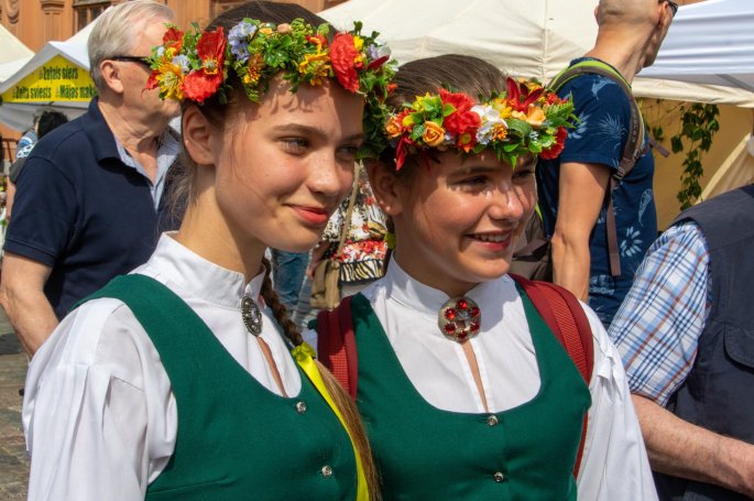 Sur la place du marché comme dans toute la Lettonie, en ce jour de solstice d’été, on voit beaucoup de jeunes filles en habillées traditionnels avec des couronnes de fleurs.