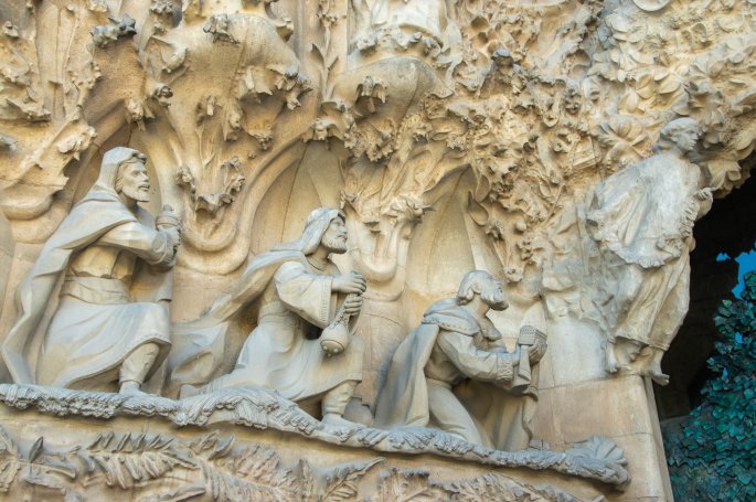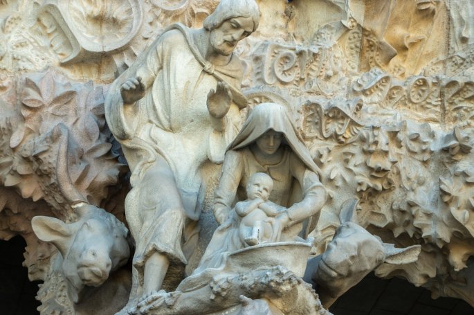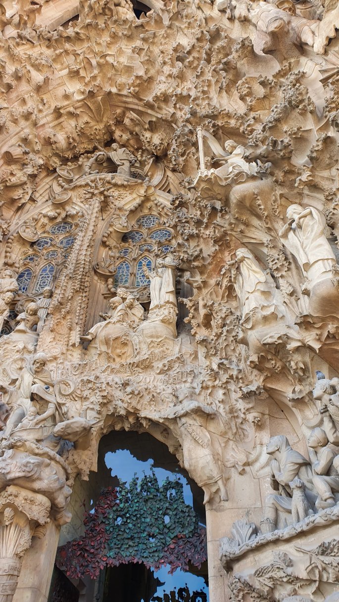 La façade Est, dont Gaudí a totalement supervisé la construction, consacrée à la Nativité, est de part sa statutaire, très classique, et aussi très chargée par ses décors. (Voir photos ci dessous)