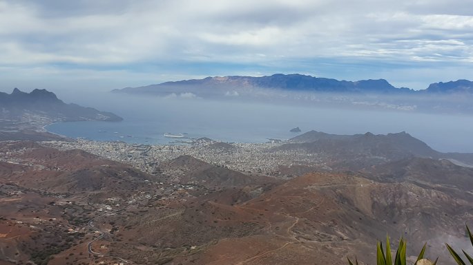 Point de vue à partir du Monte Verde. La ville de Mindelo en arrière plan, est bâtie sur les bords d’un cratère, envahi par la mer, en formant une caldeira.