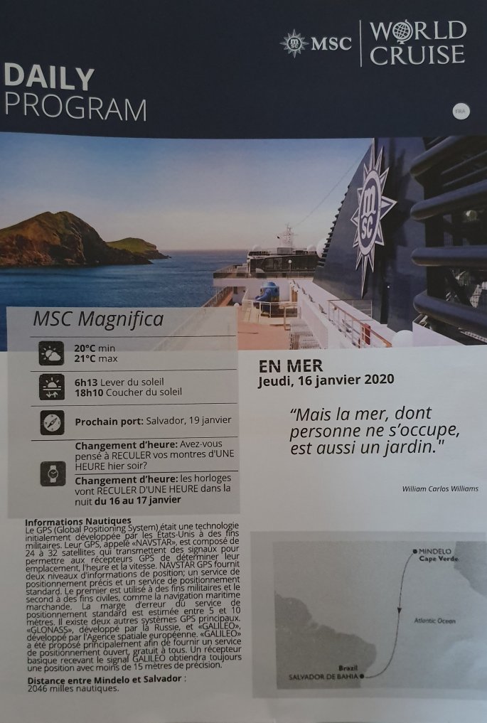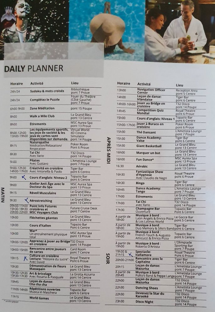 Tous les soirs nous recevons dans nos cabines un petit journal de bord, donnant quelques informations sur la navigation, mais surtout le planning de toutes les activités à bord du lendemain.