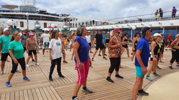 Avant notre départ, nous nous sommes interrogés pour éviter que ces jours soient des moments vides, passés à traîner sur le bateau, entre deux bars ou une chaise longue, mais des moments riches par les contacts entre nous, (au moins un petit groupe de personnes), riches au niveau culturel, et aussi des moments où l’on peut entretenir sa forme physique dans un espace somme toute restreint.