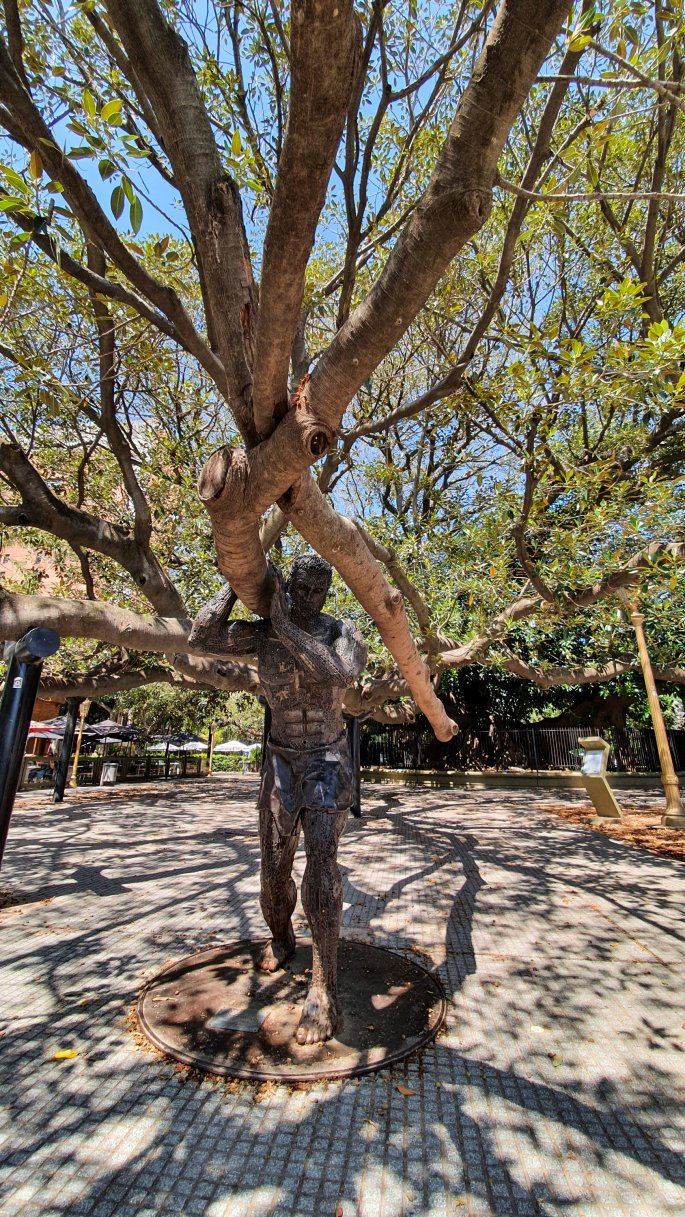 Sur la place devant le cimetière on trouve un immense caoutchouc, soutenu par un Atlas en bois.