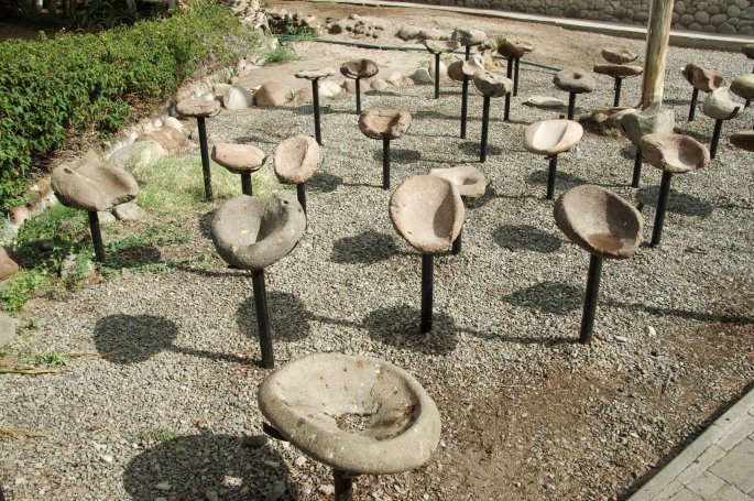 Devant le musée une exposition de nombreux mortiers retrouvés dans la région, qui servaient à faire de la farine de riz.