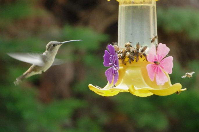 Un colibri en position stationnaire, s’abreuve.