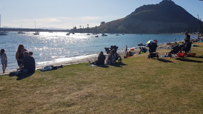 Tout près du port la petite plage de Tauranga, lieu de détente des locaux en ce dimanche.