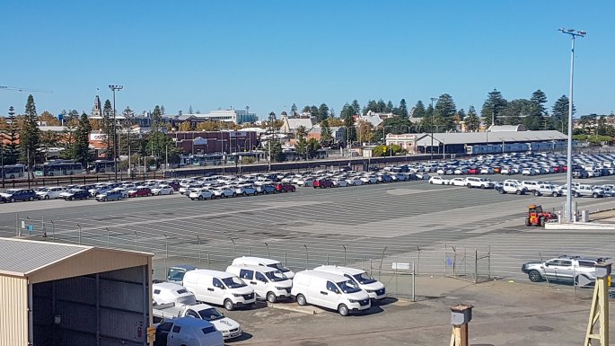 Tout semble figé au port à l’instar de ce parking où attendent des centaines de voitures neuves.