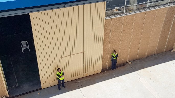 En dépit de la passerelle nous souhaitant la bienvenue (à bonne distance du bateau), nous remarquons la présence, sur le quai quasi désert, de policiers attentifs à ce que nul ne sorte du bateau.