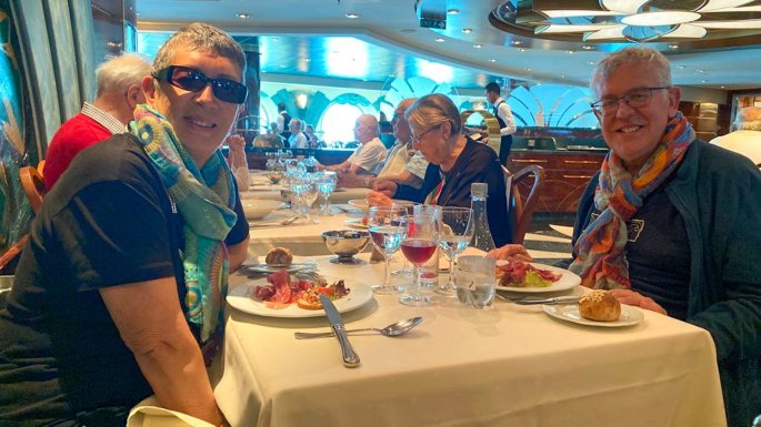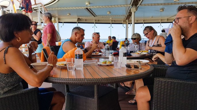 On se retrouve parfois en plus grand groupe pour déjeuner à la cafétéria.