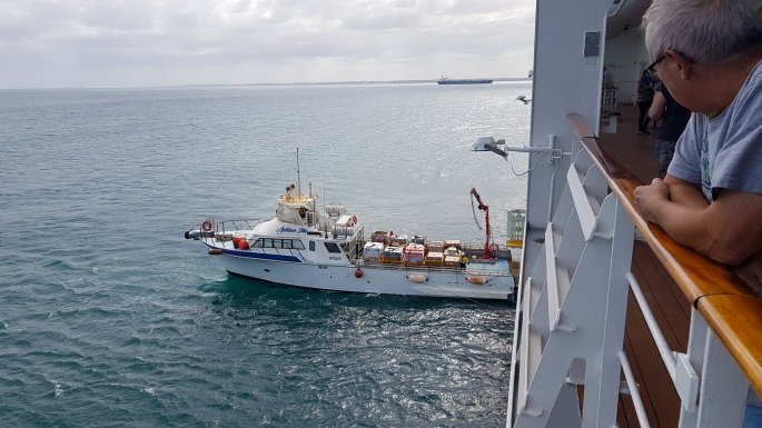 Les opérations prennent du temps car nous sommes livrés par de petits bateaux avec une quinzaine de palettes chaque fois.