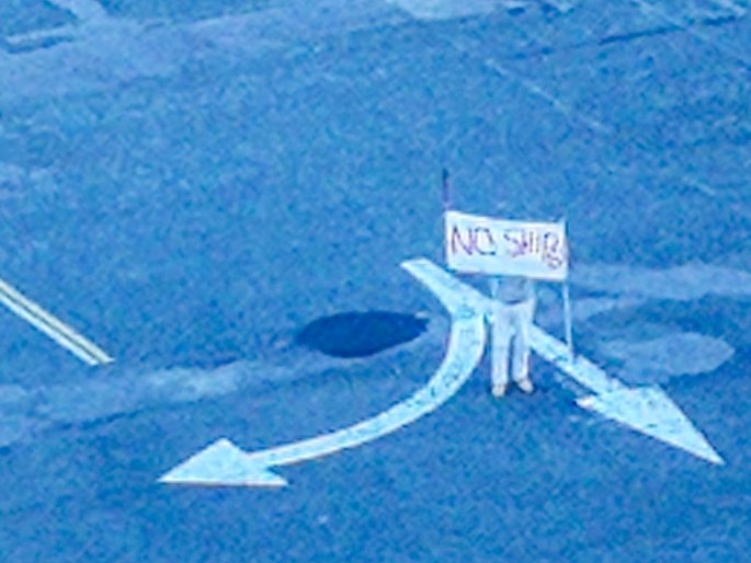 Sur un parking tout aussi désert, une personne brandit une pancarte avec seulement ces deux mots: No Ship