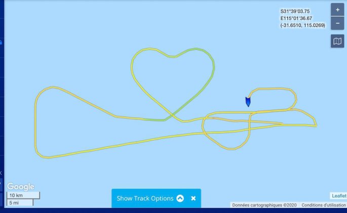 Les pilotes d’un autre navire proche de nous et dans la même situation que nous, s’amusent à décrire une jolie trajectoire en forme de cœur. Il faut bien s’occuper ! 😊