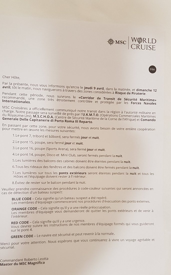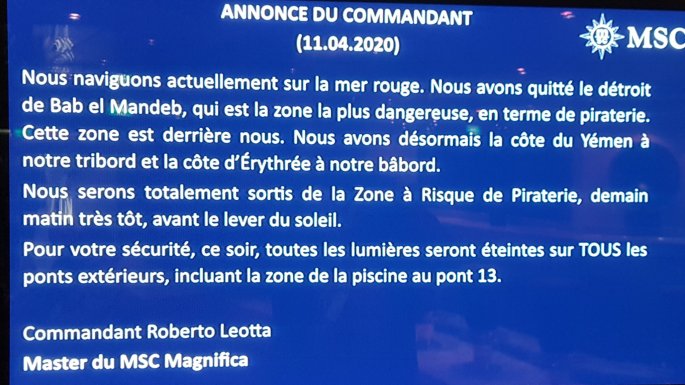 Lorsque nous arrivons à proximité du golfe d’Aden, au large de la frontière avec le Yémen, nous recevons l’information suivante avec quelques consignes à respecter pour 3 jours.