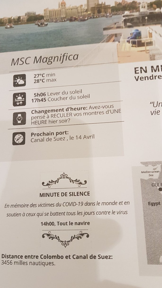 Tout d’abord la vie sur le bateau s’est immobilisée à 14h précise en mémoire des décès liés au covid et en soutien de l’ensemble des soignants. (Photo ci dessous)
