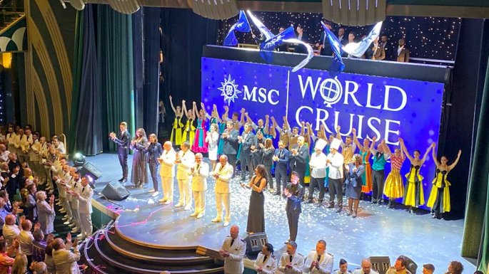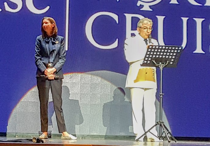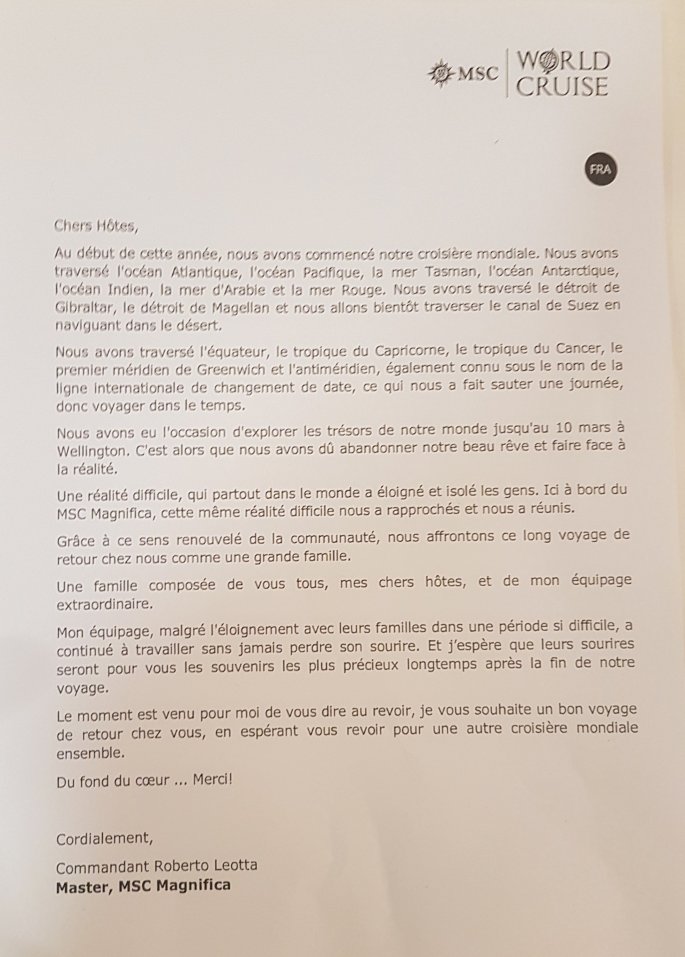 Le commandant qui reçoit dès son arrivée sur scène, une très longue standing ovation de tous, pour le remercier de la gestion de cette crise au sein du navire, nous fait un discours qui résume plutôt bien notre voyage. (Cf texte ci dessous)