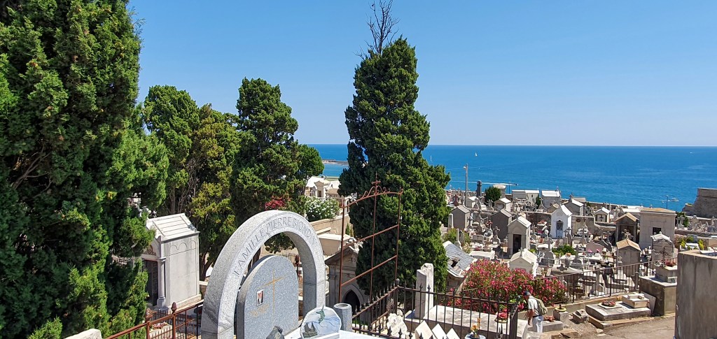 Nous achevons notre première journée à Sète, par la visite du cimetière marin, avec la tombe de Paul Valery. (Brassens est inhumé dans un autre cimetière, « Le PY », que nous visiterons dans 2 jours.)