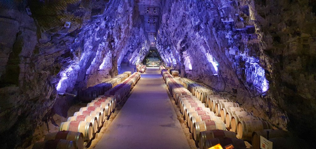 Ce qui est intéressant c’est que la visite n’est pas uniquement centrée sur le vin, mais un son et lumieres accompagne la visite et raconte l’histoire de la région depuis l’époque romaine jusqu’à l’exploitation du gypse au XX ème siècle et bien sûr la conversion du lieu pour l’élaboration des vins.
