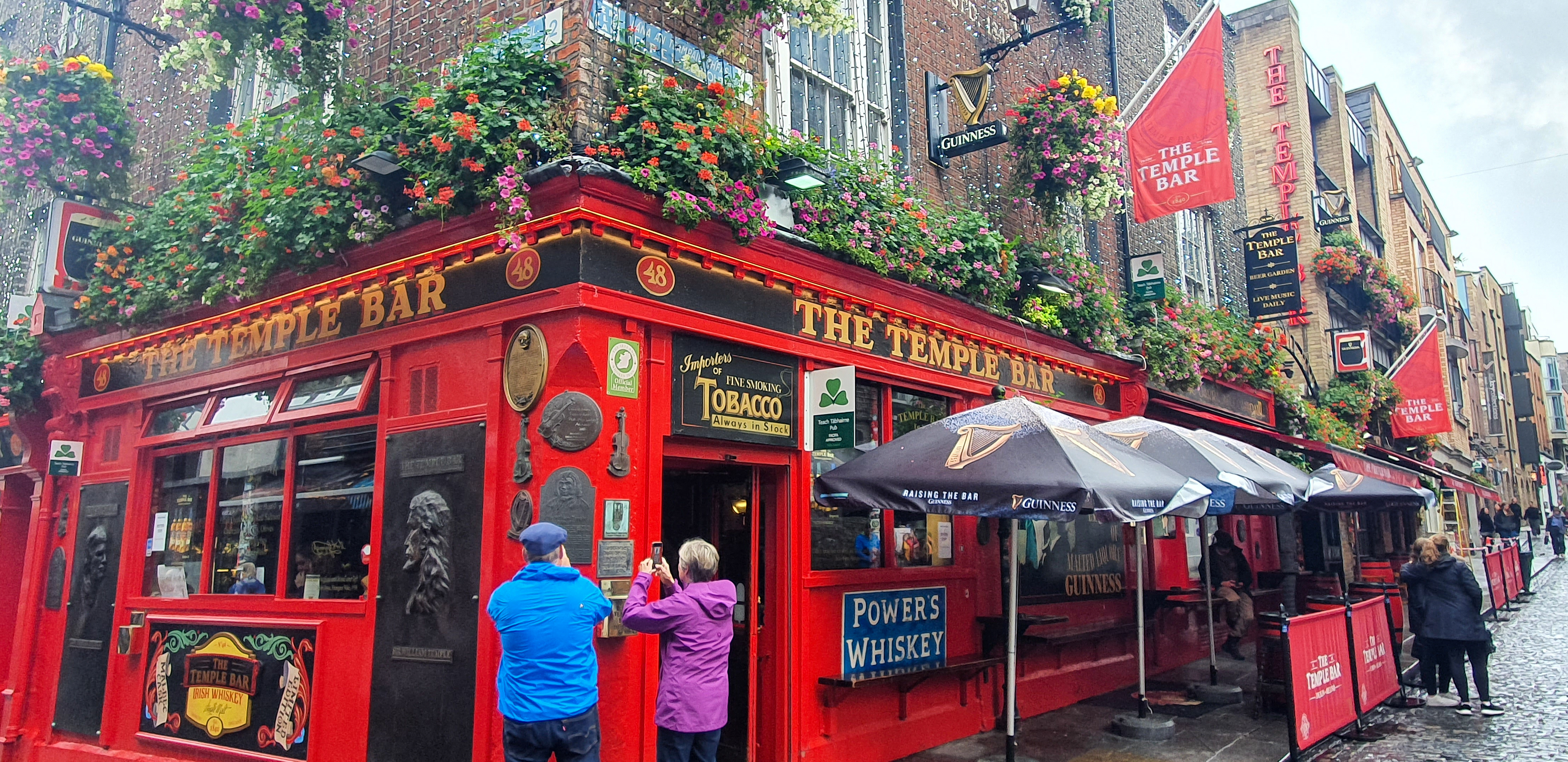 Temple Bar est le quartier des pubs, des théâtres, de la vie culturelle de Dublin. Son nom n’est pas lié à sa profusion de bars, mais à un philosophe du XVIIème siècle Sir William Temple qui a fait l’acquisition de ce quartier et qui lui a donné son nom, associé au lieu de sa propre habitation située promenade Bar.