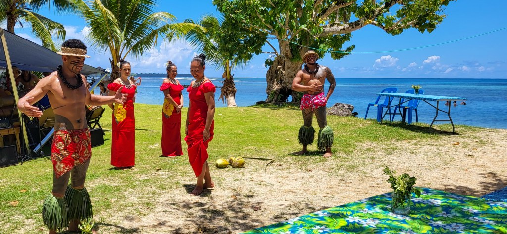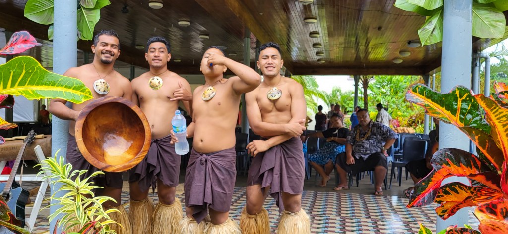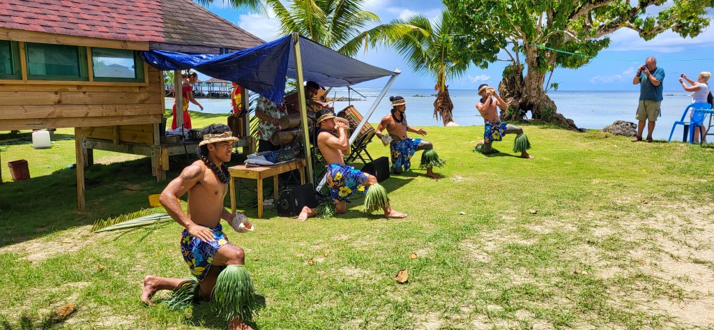 Nous arrivons dans un petit village, où nous allons avoir un peu de temps, pour se baigner (pour certains), déjeuner de mets locaux, profiter de quelques danses et chants, admirer la dextérité de nos hôtes lors de démonstrations de tressage de feuilles de palmiers pour constituer des plats, ou de cueillette de noix de coco.