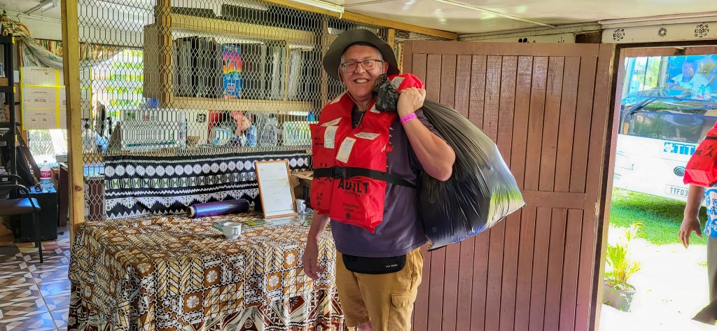 Prêt à embarquer sur le Navua, le sac à dos protégé dans un sac poubelle.