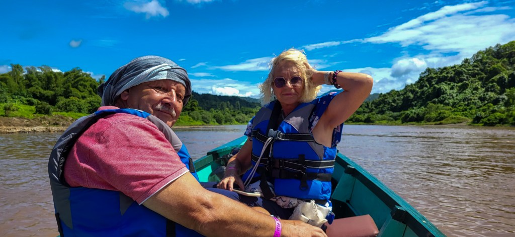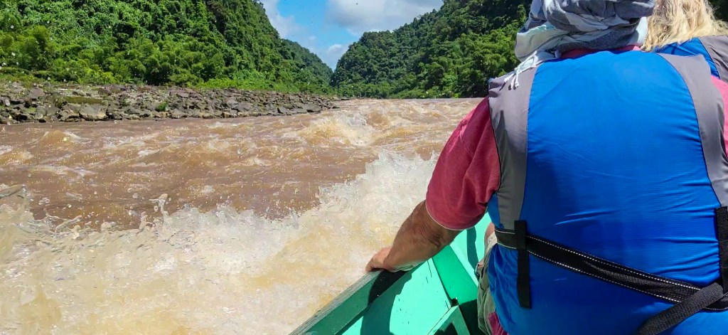 Nous devons passer quelques rapides, notre pilote gère tout çela avec finesse, on comprend mieux pourquoi on nous a demandé de protéger nos sac à dos !!!!