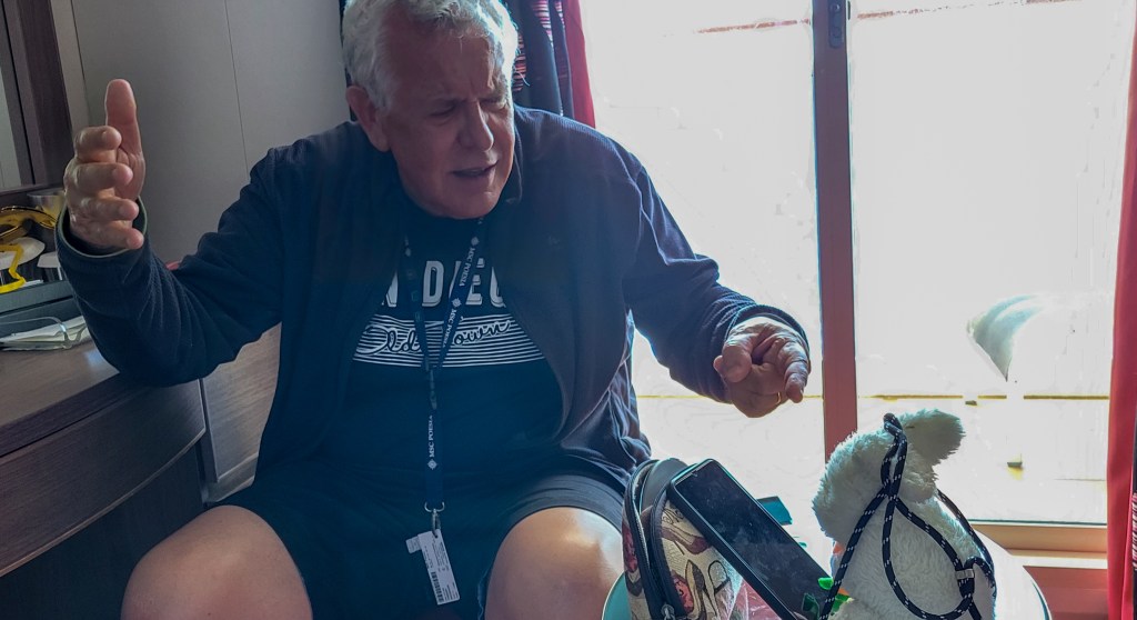 La traversée de l’équateur avec sa traditionnelle fête du passage de la ligne, où Neptune remet au Capitaine, la clef qui symbolise l’entrée dans l’hémisphère sud. Les passagers qui le désirent sont baptisés , en se jetant dans la piscine, après avoir été barbouillés de farine. Lapinou, n’a pas souhaité se joindre aux festivités, craignant de se voir oindre de moutarde ou de ketchup !!!