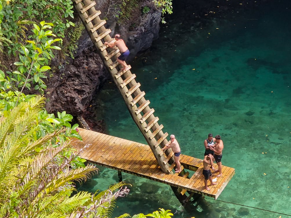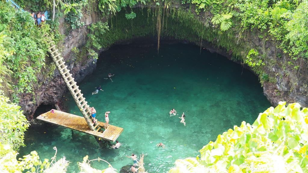 Sur le chemin du retour, nous nous arrêtons dans un site, où l’on découvre un énorme trou qui forme une profonde piscine naturelle alimentée par l’océan proche.