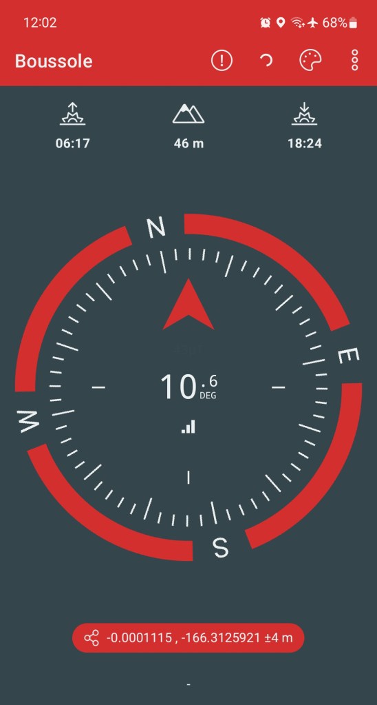 J’ai réussi à capturer l’image du passage de l’équateur à la boussole Gps au 1/10000 eme de degré, (11 mètres près)
