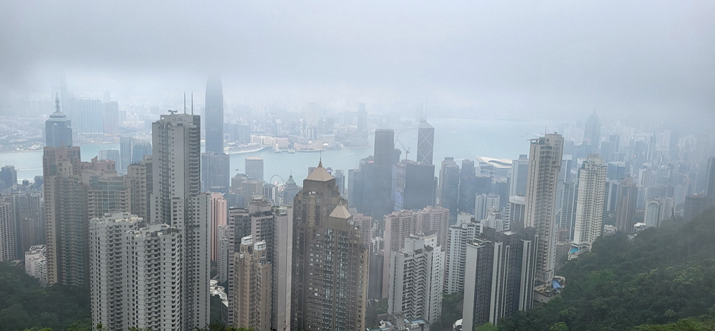 Ce matin en arrivant à Hong Kong nous n’avons pas de vue exceptionnelle de la baie, car un brouillard dense cache tout panorama.