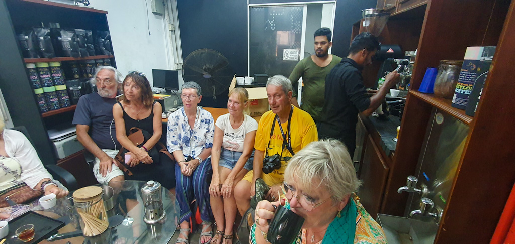 7 tuks tuks viennent chercher notre petite équipe de 14 personnes au port, et nous transporte pour commencer, au cœur de la ville dans une petite échoppe spécialisée en cafés de très hautes qualités.