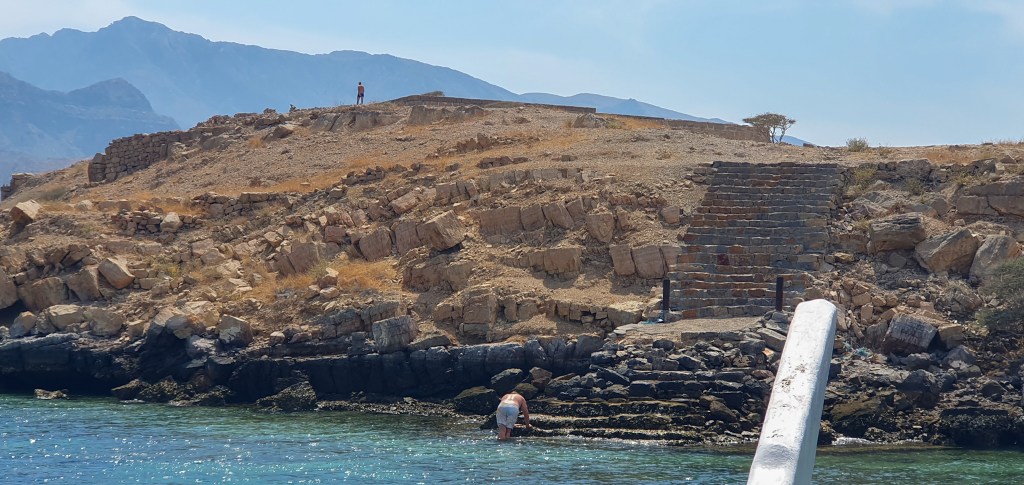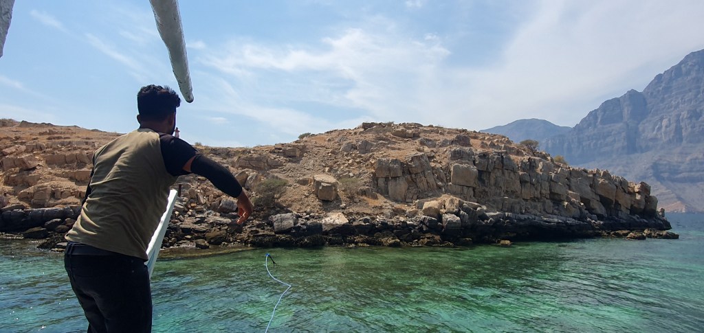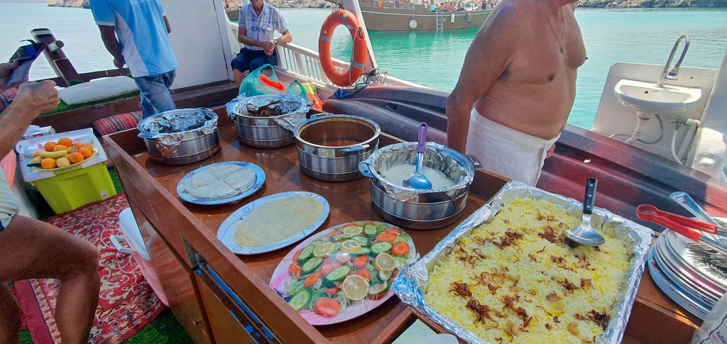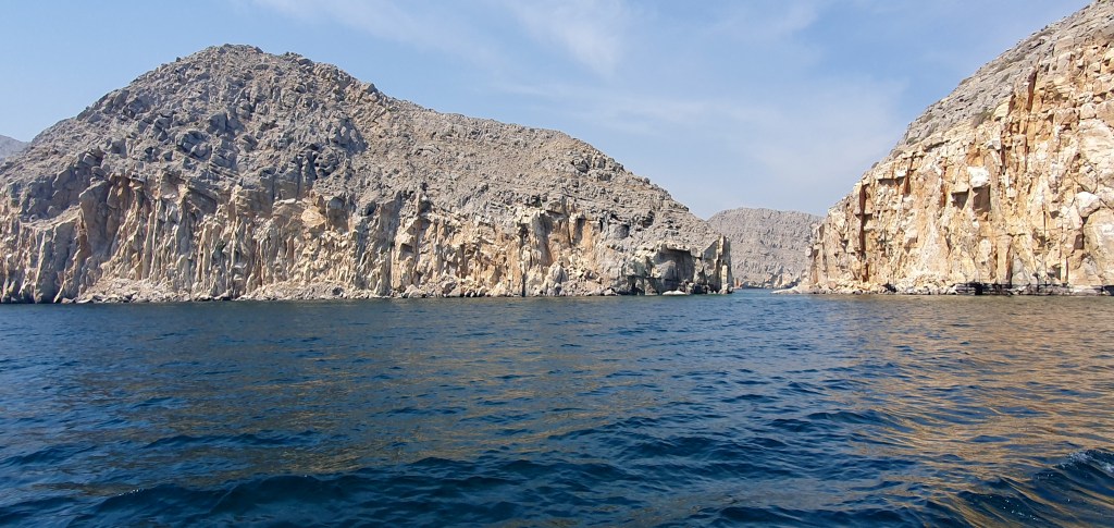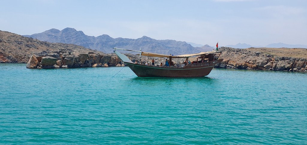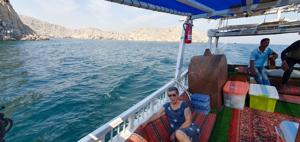 C’est à bord d’un bateau traditionnel (un dhow) que nous allons passer la journée pour nous promener dans ces fjords au milieu de bras de mer entre des falaises arides.