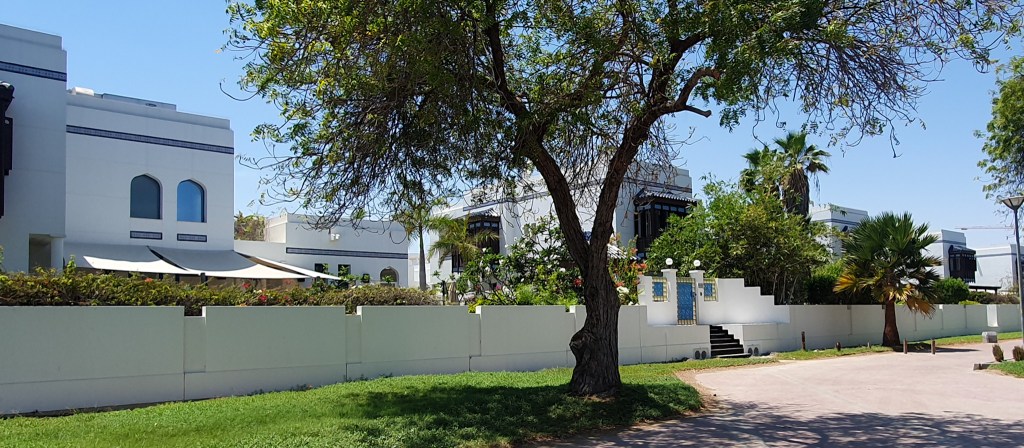 Voilà quelques photos des rues autour de l’opéra. Il y a une vraie unité architecturale dans cette ville avec ces bâtiments blancs de quelques étages seulement, de l’espace avec des pelouses et des palmiers. C’est luxueux sans être ostentatoire, nous sommes bien loin de Dubaï. Le Sultanat d’Oman mérite bien son surnom de Suisse arabe.