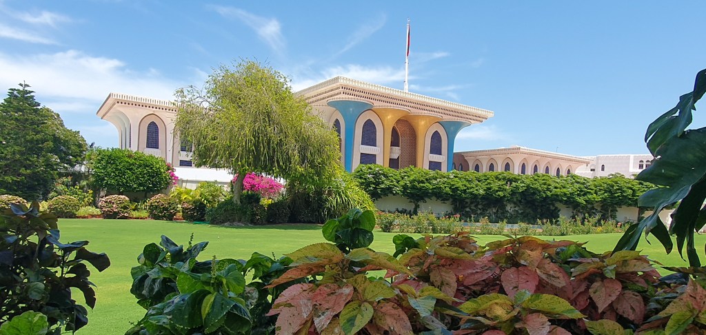 Nous faisons un arrêt au palais du sultan d’Oman. Ce palais qui ne se visite pas est le lieu de résistance des invités de marque du sultan. C’est un bel exemple de mélange d’architecture moderne et traditionnelle.
