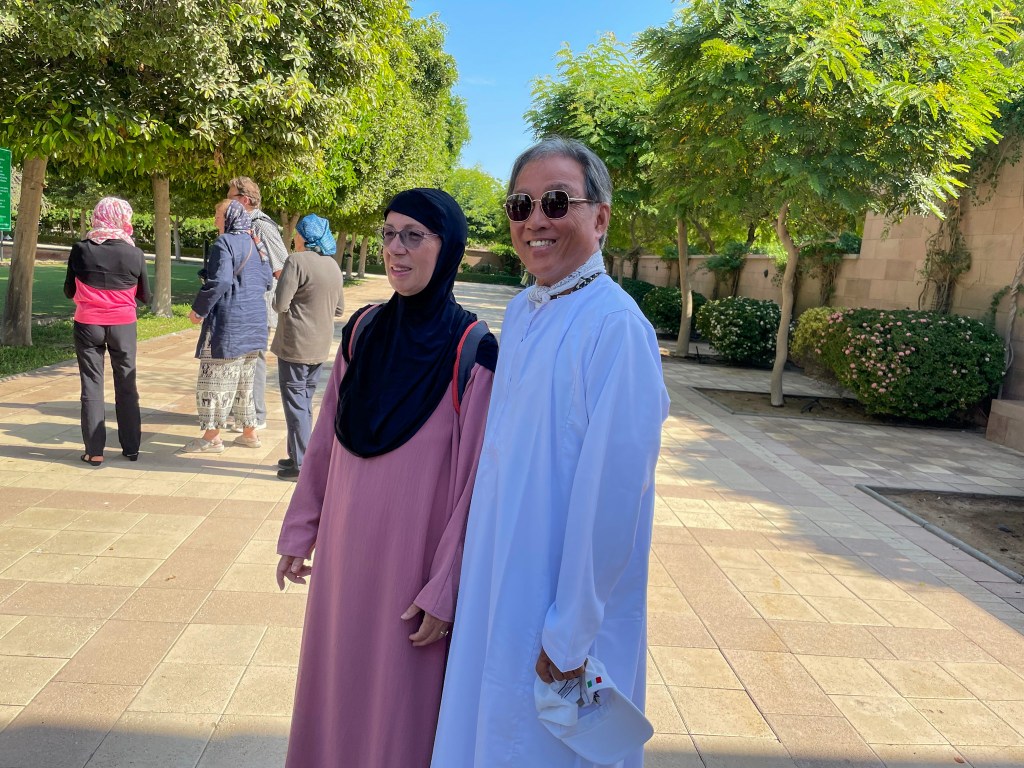 Dans les jardins de la mosquée Évelyne et notre ami Kim.