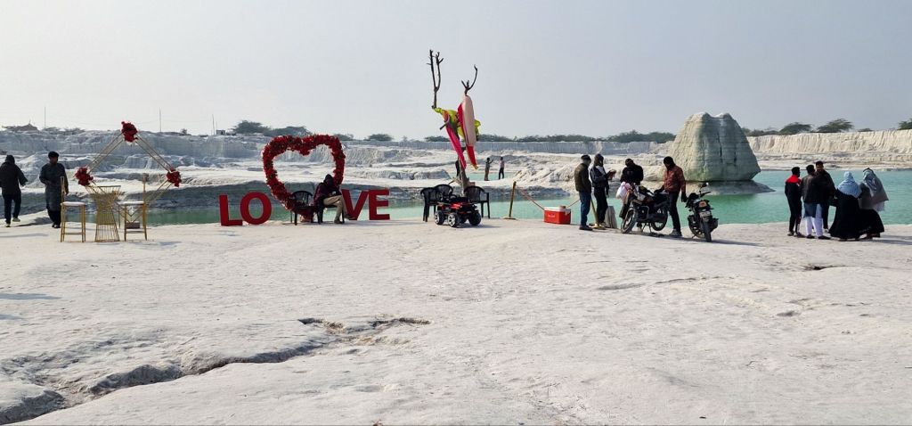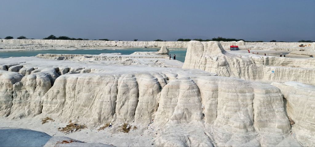 Less ouvriers ont stocké les poussières et petits déchets issus de l’extraction sur un site proche de la carrière. Au fil du temps ce site s’est transformé en un paysage étrange très prisé des Indiens qui s’imaginent être à la montagne dans la neige.