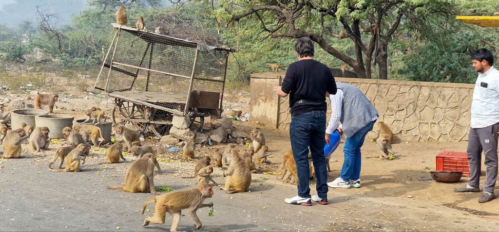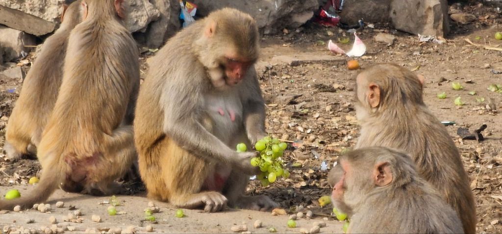 Sur le bord de la route, on voit de nombreux singes qui attendent que les chauffeurs de camions ou voitures leur achètent des fruits auprès de marchands ambulants présents sur la route.